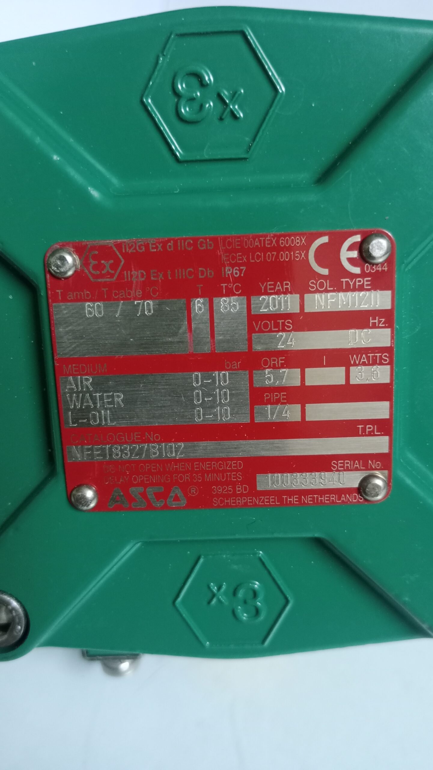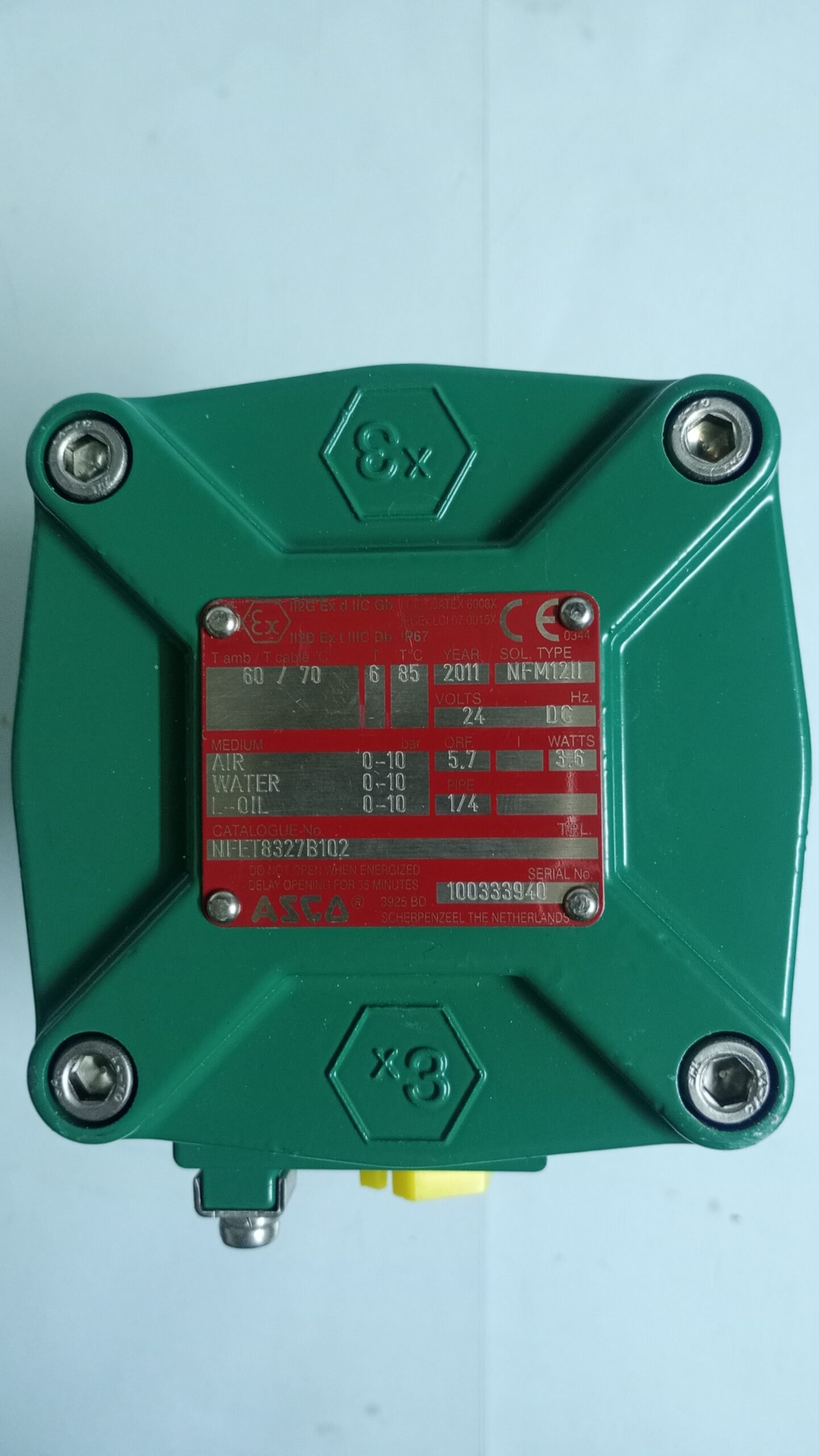 ASCO Solenoid Valve NFM1211 NF8327B102 24V DC is a high-quality industrial valve designed for precise fluid control applications. Rated at 24V DC, 3.6 watts, and operating pressure range 0–10 bar, this 1/4″ valve ensures reliable and efficient performance.